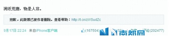 其实到昨日截稿时间为止,还有一条没删的!那条微博如果用“老凌”为关键字搜索,不知道是因为微博有B U G还是什么原因,是搜索不到的,也许这就是它漏网没被删掉的原因。
