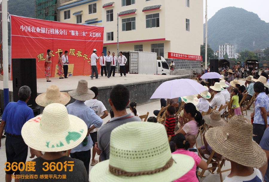 中国农业银行阳朔支行认真贯彻落实总行农村产业金融业务“千百工程”部署,立足本地发展,立足特色经营,围绕地方政府旅游产业发展布局,全面支持阳朔旅游转型和升级发展,同时也实现了各项业务的快速发展。(图为:中国农业银行阳朔支行惠农大戏送到田头之图为在阳朔福利镇集市演出吸引了农民参观)