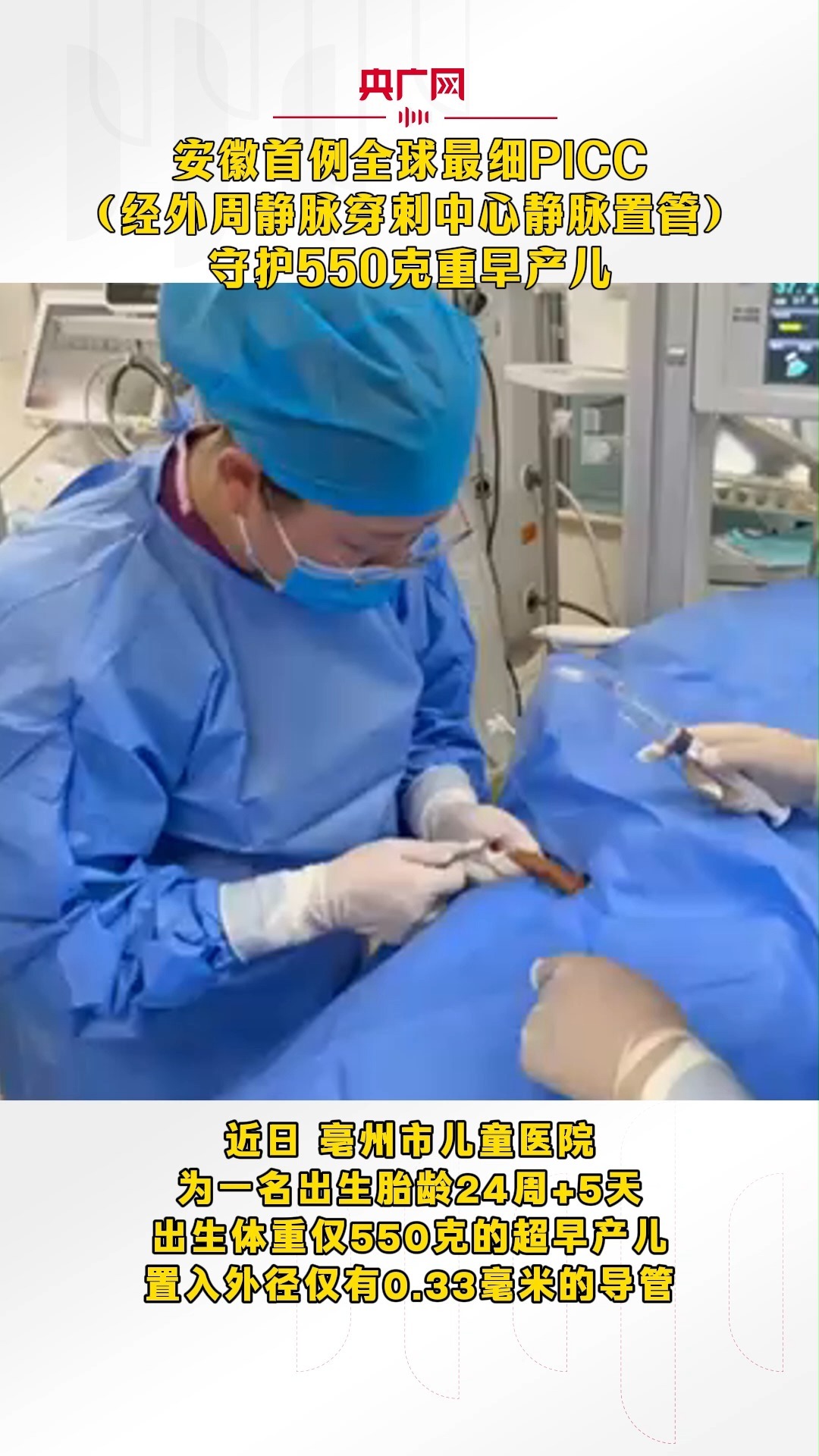 近日,安徽省亳州市儿童医院儿童重症医学科护理团队,成功为一名出生胎龄24周+5天、出生体重仅550克的超早产儿,置入1.0Fr(外径0.33毫米)PICC导管。1.0Fr PICC导管为全球最细规格,此次应用系安徽省首次开展。