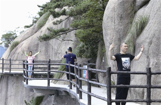 7月14日,游客在九华山花台景区栈道上留影。记者 左泽川 摄
