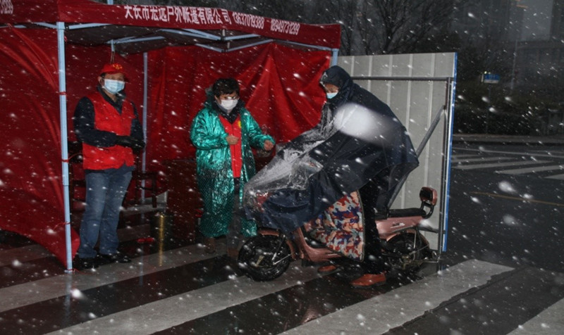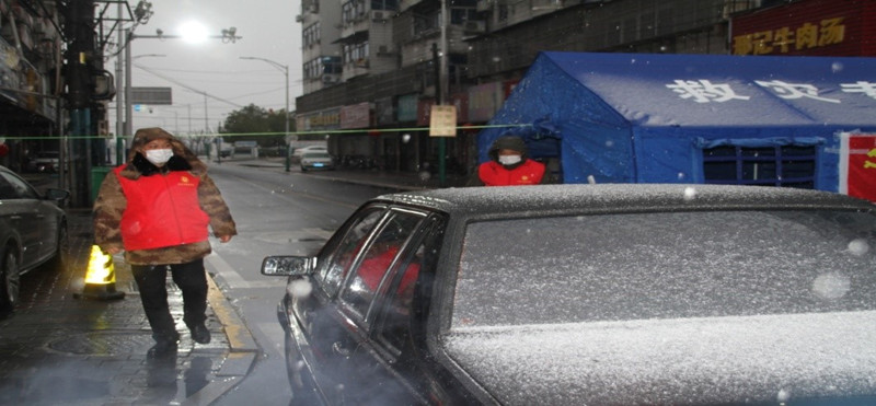“昨天风大,先是雨,后是雪。我们设在一个小区卡口的帐篷一连倒了两次。没办法,最后我们索性开来一辆面包车,车厢就是临时检查站,拉上一根绳就算是栏杆。再困难,任务也要完成,阵地不能丢。”想到15号一整天,自己的十多位同事风雪中坚守岗位的经历,天长市人民检察院办公室副主任段彦菁依然十分感动。“天很冷,但是我们的心里是热乎乎的。看到志愿者吃饭喝水有困难,有个小区居民带着驱寒用的红枣汤和茶叶蛋、方便面,下楼送到我们手中。丢下东西就走,直到现在,我们都不知道他的姓名。”