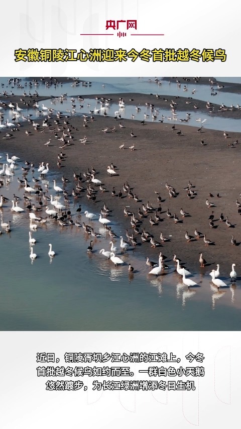 近日,铜陵胥坝乡江心洲的江滩上,今冬首批越冬候鸟如约而至。一群白色小天鹅悠然踱步,为长江绿洲增添冬日生机。