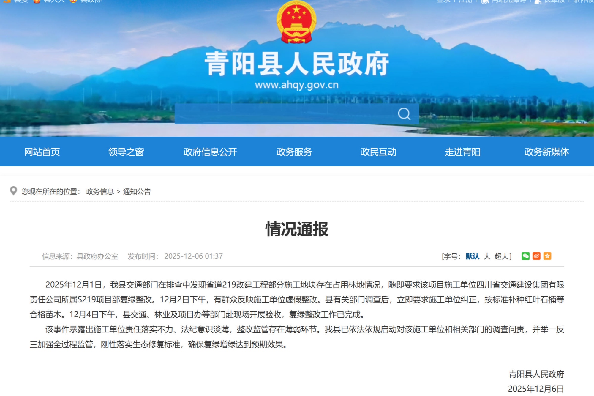 青阳县已依法依规启动对该施工单位和相关部门的调查问责。