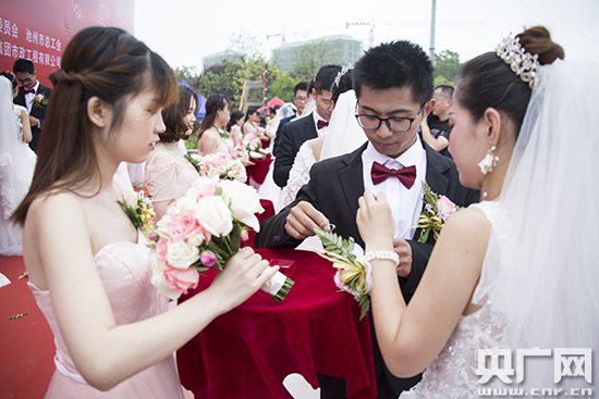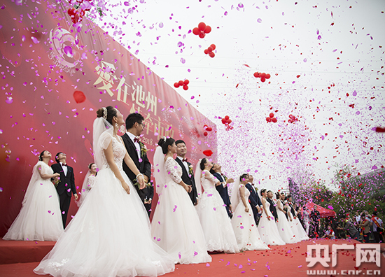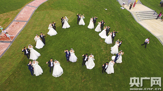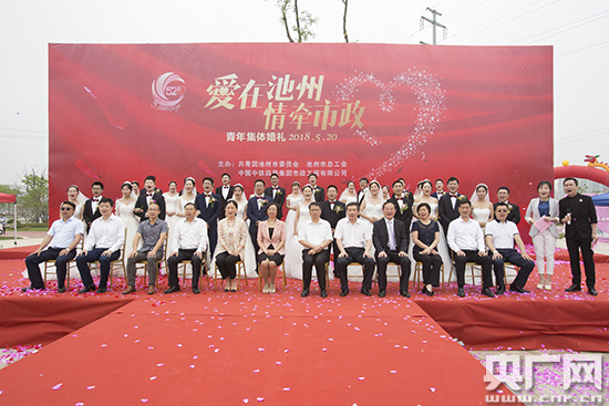 央广网池州5月20日消息 行尽池城皆是景,一城山水满城诗。在风景如画的池州市天堂湖公园,5月20日上午,伴随着悠扬的萨克斯演奏,来自中铁四局市政公司的十六对新人,在亲人和同事的见证下,在浪漫的婚礼进行曲中,翻开了未来人生的新篇章。