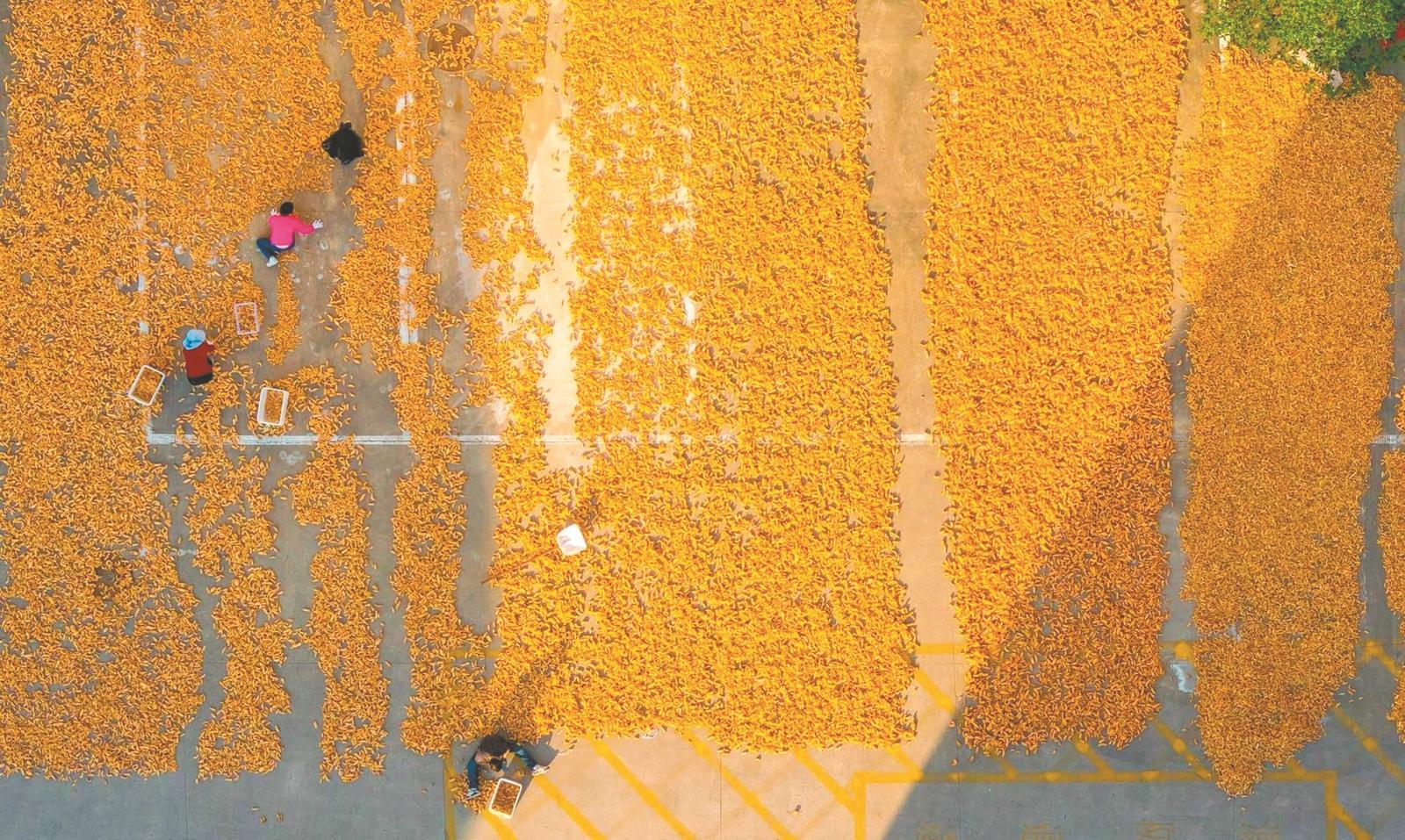 在位于金寨县的中国药用菌大市场,药商正在晾晒药材。