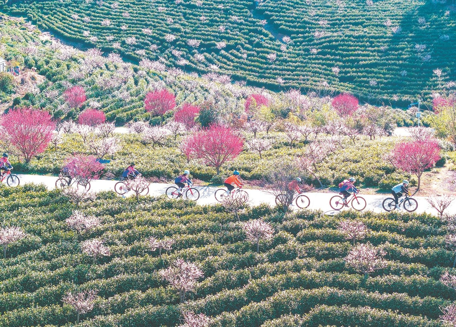 2月21日,自行车运动爱好者在芜湖市繁昌区孙村镇梅冲村生态茶园里骑行游玩,欣赏乡村风景,乐享假日美好时光。