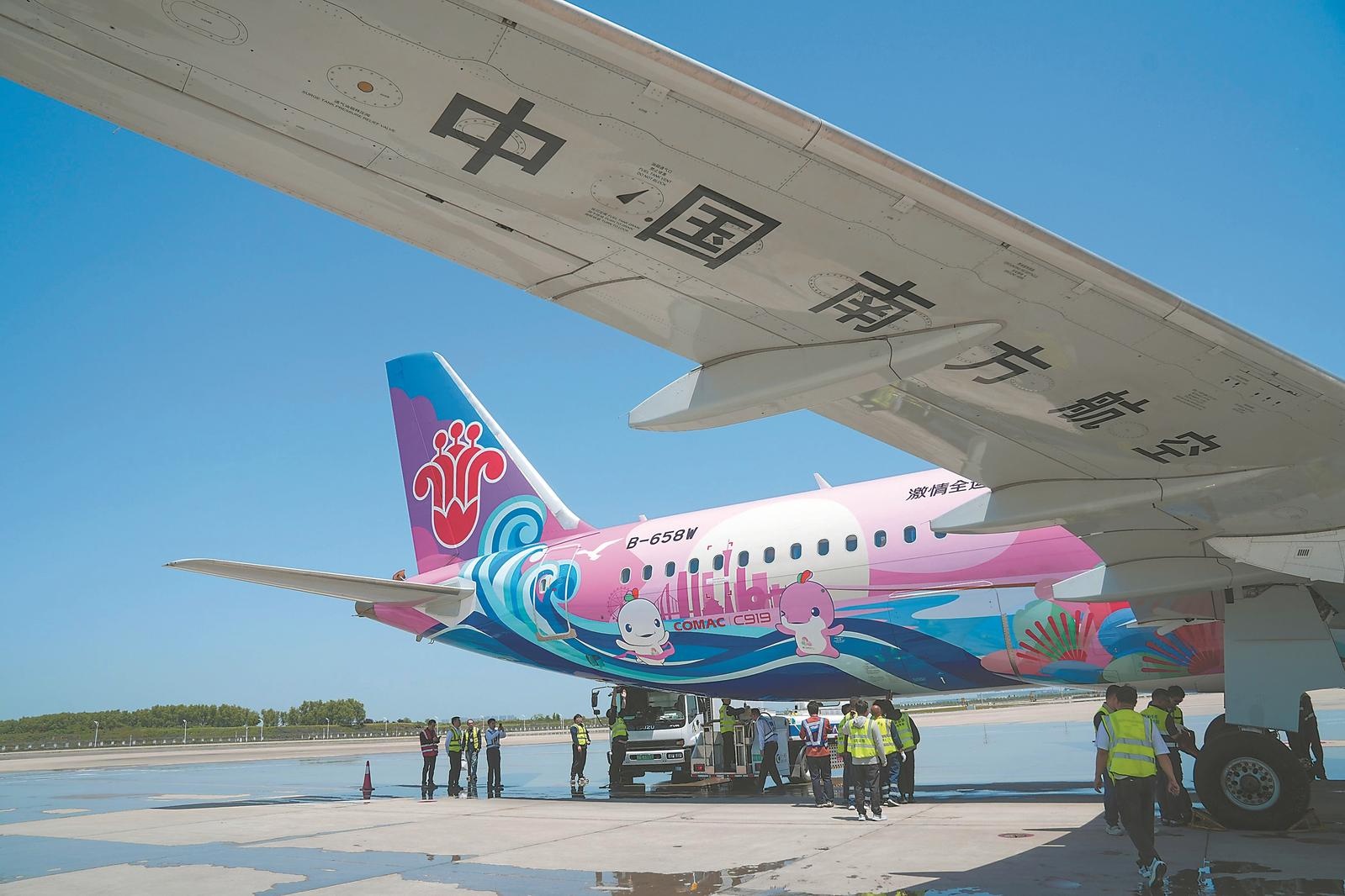 4月26日12时,一架南航C919型飞机平稳降落在合肥新桥国际机场。这是合肥新桥国际机场首次运营由国产大飞机执飞的客运航班。据了解,4至5月份,合肥至广州航线将由南航C919执飞44班。记者 李博 丰静 摄