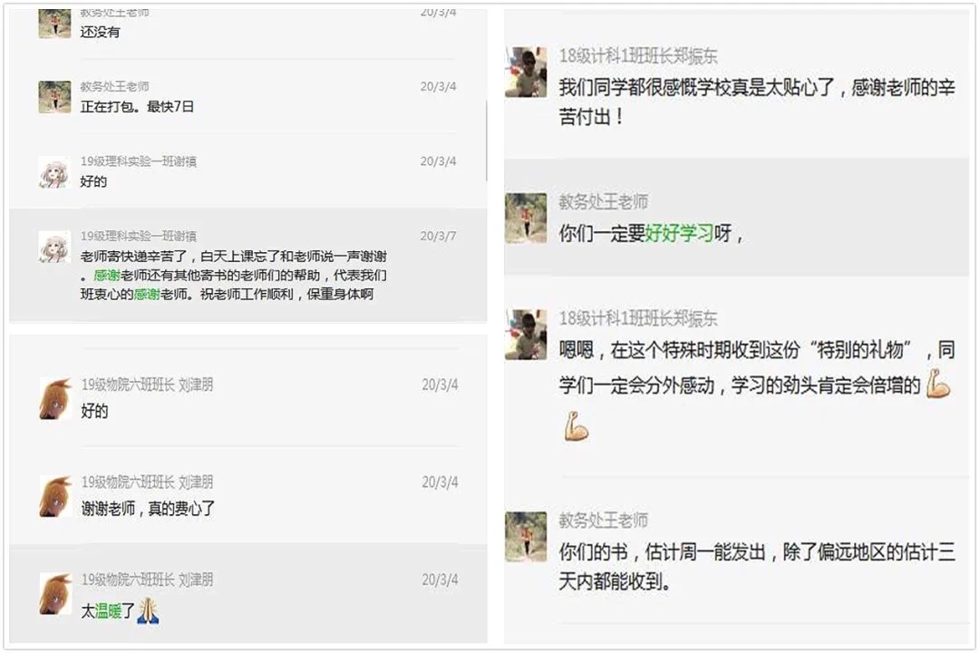 得知学校为学生免费邮寄教材的消息,部分中国科大同学在微信中表示,感到很温暖,在这个特殊时期收到这份“特别的礼物”,“学习劲头倍增”。还有多名湖北籍学生家长也打电话到学校教材科感谢学校的贴心服务,并表示一定配合学校的线上教学,安排好学生日常生活,让学生在家也能安心读书。
