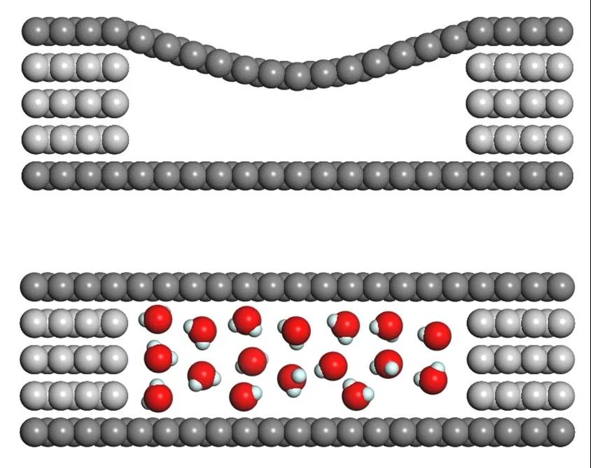 水分子(红色)在石墨烯通道(灰色)内发生凝聚后,通道的变形消失。(制图:王奉超)