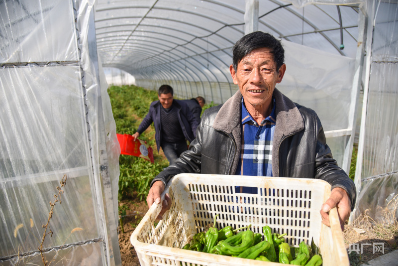 眼下,在坎山村的蔬菜种植大棚内,郁郁葱葱的青椒挂满枝头,长势喜人,村民们正穿梭其间忙着采摘。