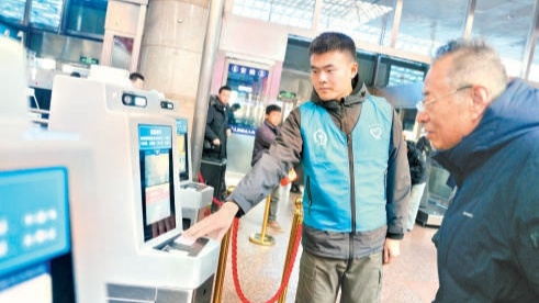 2月2日是春运首日,也是北京邮电大学大三学生蒋戈乐2026年当“蓝马甲”的第一天。作为一名积累了3年春运志愿服务经验的“老手”,他揣着自编“秘籍”,游刃有余地在北京西站二层进站检票口服务。