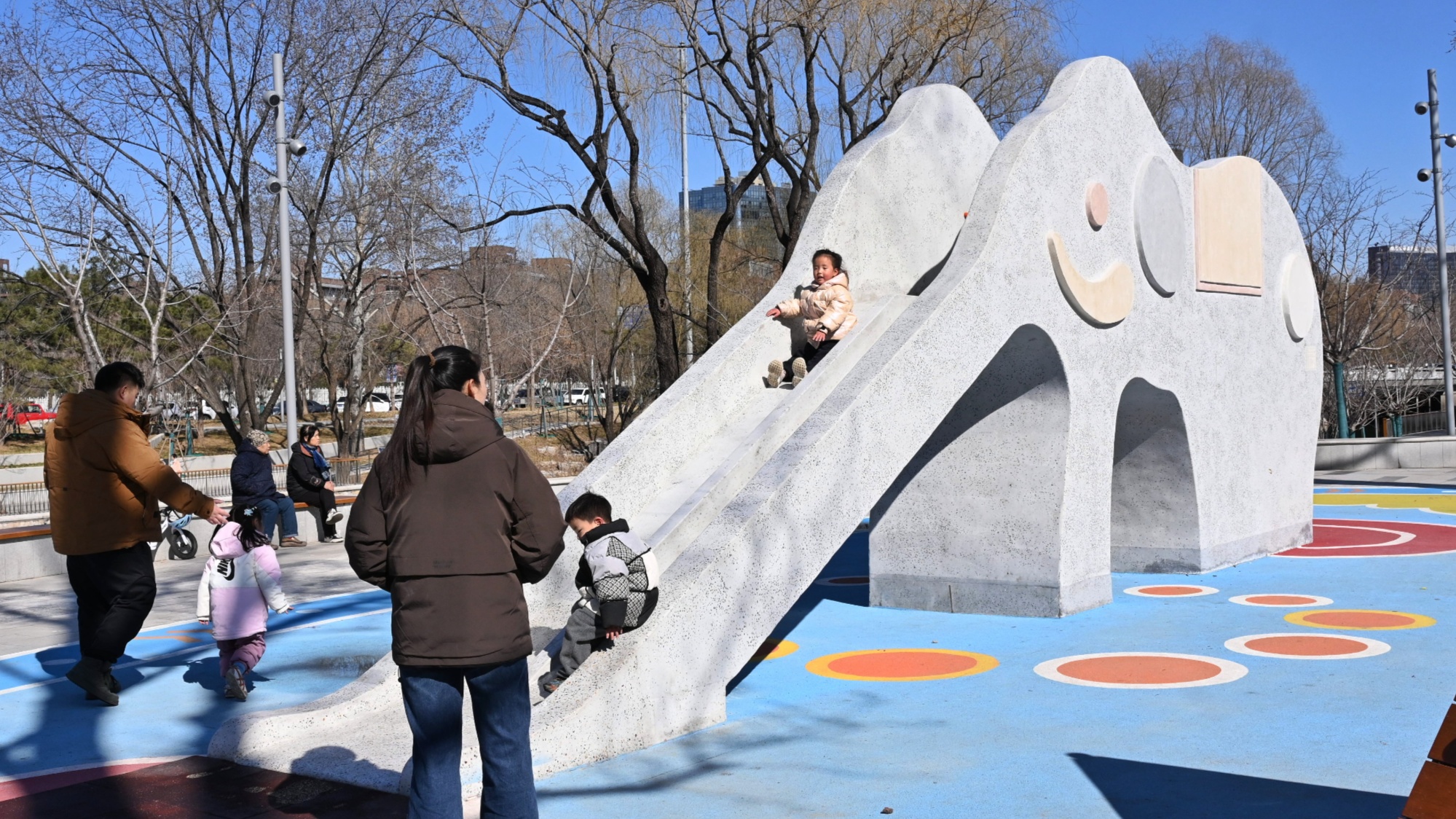 近日,北京北小河南岸新增两座憨态可掬的大象滑梯。它们凭借萌趣造型迅速走红,成为居民休闲遛娃、拍照打卡的新地标。