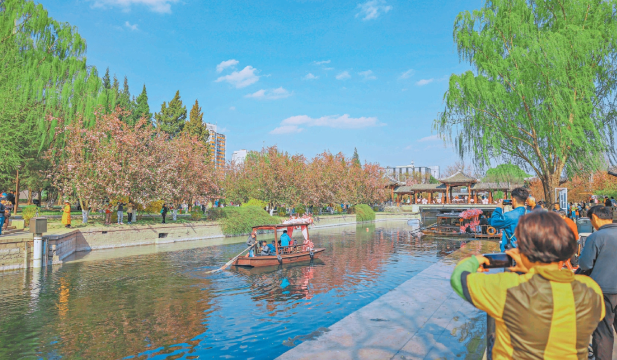 “开船喽……”4月1日下午,元大都城垣遗址公园东土城沟码头处,随着一声响亮的吆喝,船夫解开摇橹船的绳索,船儿缓缓出发,在粼粼波光中轻轻摇曳,与岸边海棠相互映衬。