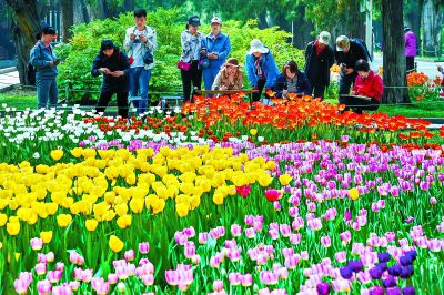 “五一”假日,游人来到中山公园,观赏郁金香、洋水仙、葡萄风信子等95个品种30余万株世界名花。本报记者 邓伟摄