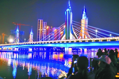 晚6时许,随着夜幕降临,运河两岸灯光渐次亮起。沿河树木在环形灯、投光灯、星星灯的映照和点缀下,如火树银花,如星河璀璨,变成梦幻般的童话世界。一座座桥梁被灯光通体照射,白天灰色的桥体,摇身一变成为流光溢彩、各具风姿的大型艺术装置。桥上灯光与水面倒影交相辉映,共同构成一曲奇幻、壮阔的城市交响曲。