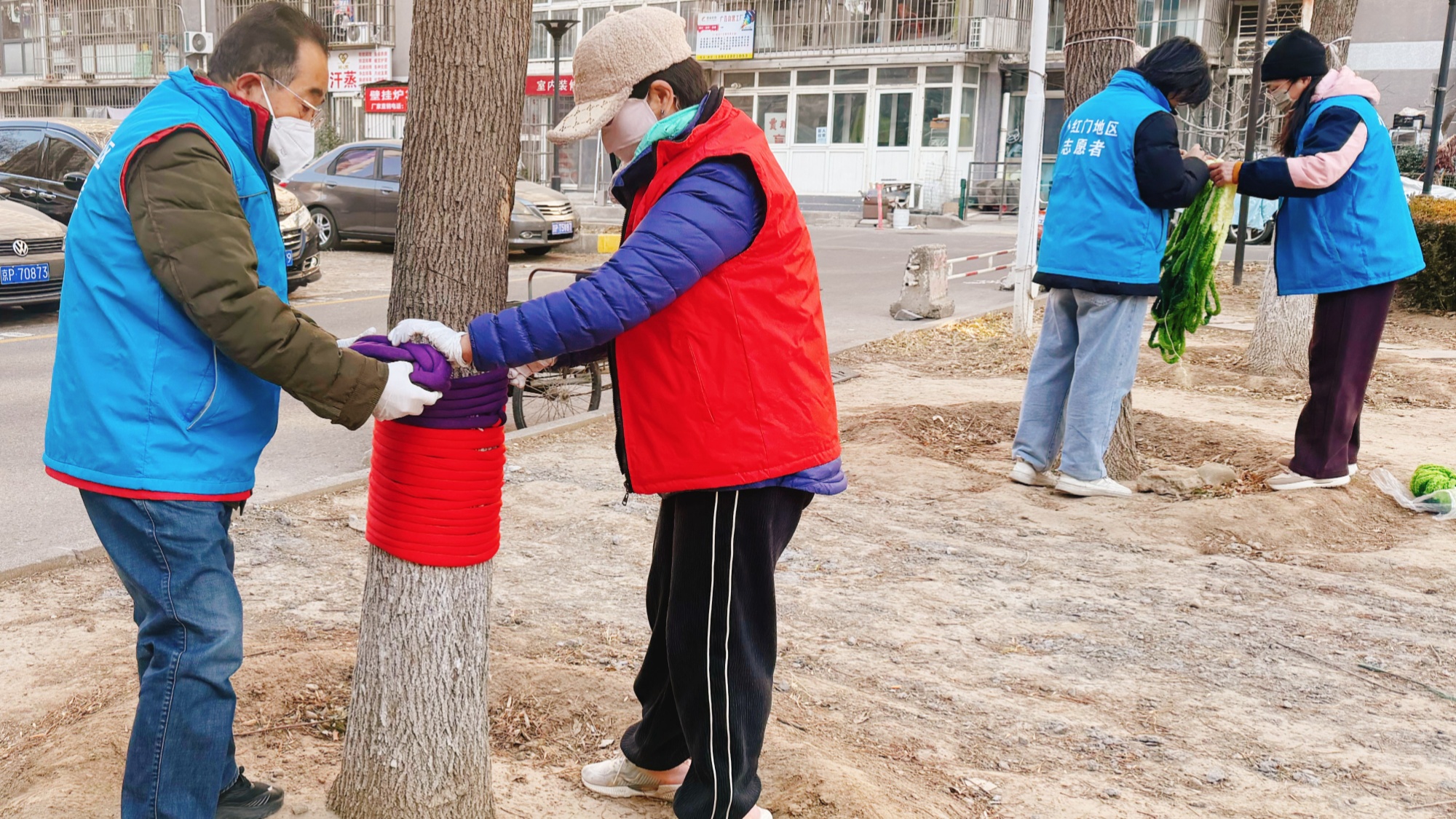 北京朝阳区小红门乡居民为大树“穿衣”