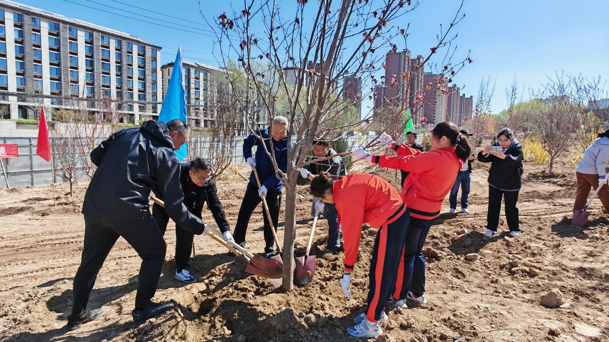 这片占地近30亩的地块,原是辛庄村南营一处棚改腾退后的闲置地块。项目主体完成房屋腾退拆除后,一直处于围挡封闭苫盖的状态,此次镇政府牵头,联动辛庄村及周边企业,共同打造街边公园。北宫镇将其纳入今年镇级义务植树点位,不仅用于绿化提升景观品质,还打出了一套“增绿+惠民”的组合拳。