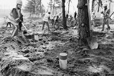 不止是“呼吸”管道,这片绿地施工现场还有不少有意思的细节:平常种树,都会在填好的树坑外头做一个围堰,方便浇水;可在这里的“千年守望林”,从拆迁村移植来的大树,统统都是双层围堰,即以树苗为中心,组成同心圆或者回字形,两个围堰分别浇水,为根系补给充足的水分。