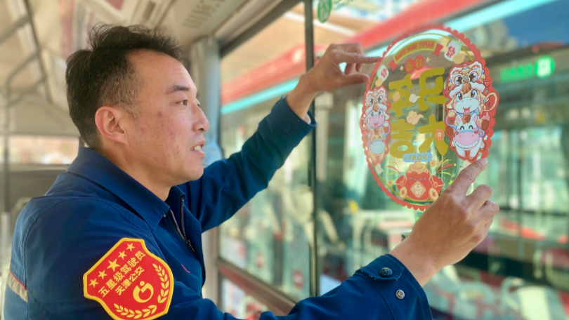 天津公交第二客运公司一线职工用心装扮节日车厢,让一辆辆公交车满载着新春祝福穿行在津城街道,为市民冬日出行增添融融暖意。
