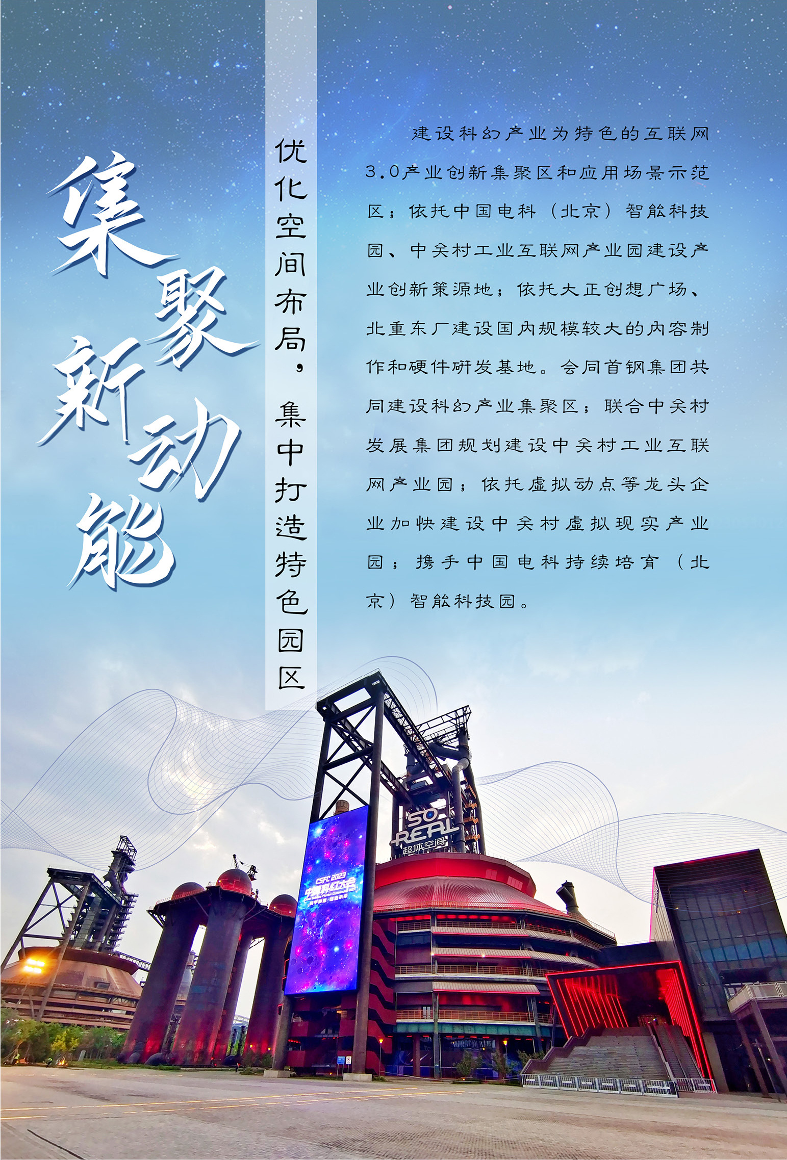 石景山区会同首钢集团共同建设科幻产业集聚区,成功举办三届中国科幻大会,成立全国首个科幻产业联合体;设立全国首支科幻产业基金;揭牌“中关村科幻产业创新中心”,中关村通力成为首批北京国际化引领型标杆孵化器,引入北极星途、西克魔迩等优质企业66家。