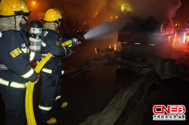 接到报警后,当地消防部门迅速出动2辆消防车和16名官兵赶赴现场展开扑救。到达事故现场后,消防官兵看到满载货物的大型加长货车火光冲天、浓烟滚滚,大火正处于猛烈燃烧阶段,燃烧的轮胎发出“噼啪”的响声。货车油箱处于高温炙烤状态,若不能及时控制火势,后果将不堪设想。