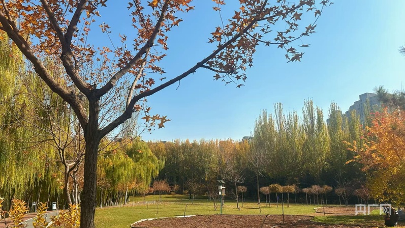 宁夏银川秋日城市公园,彩树蓝天相映,秋意烂漫,尽显城市宁静与绚烂的秋之韵味。
