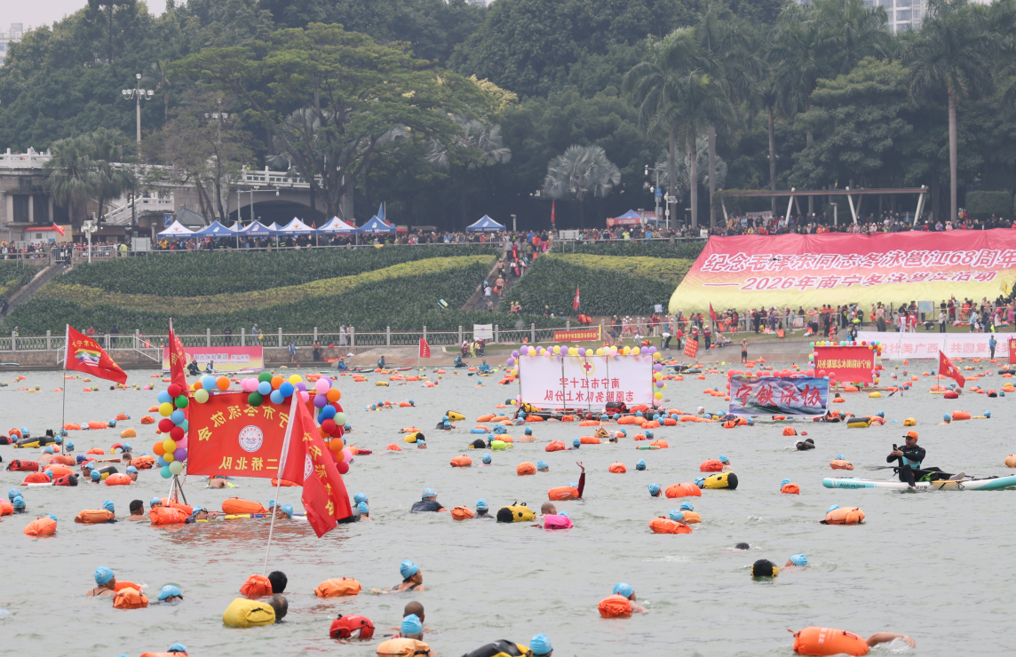 1月1日上午,广西南宁邕江大桥畅游阁水域热闹非凡,2026年南宁冬泳邕江活动在此举行。
