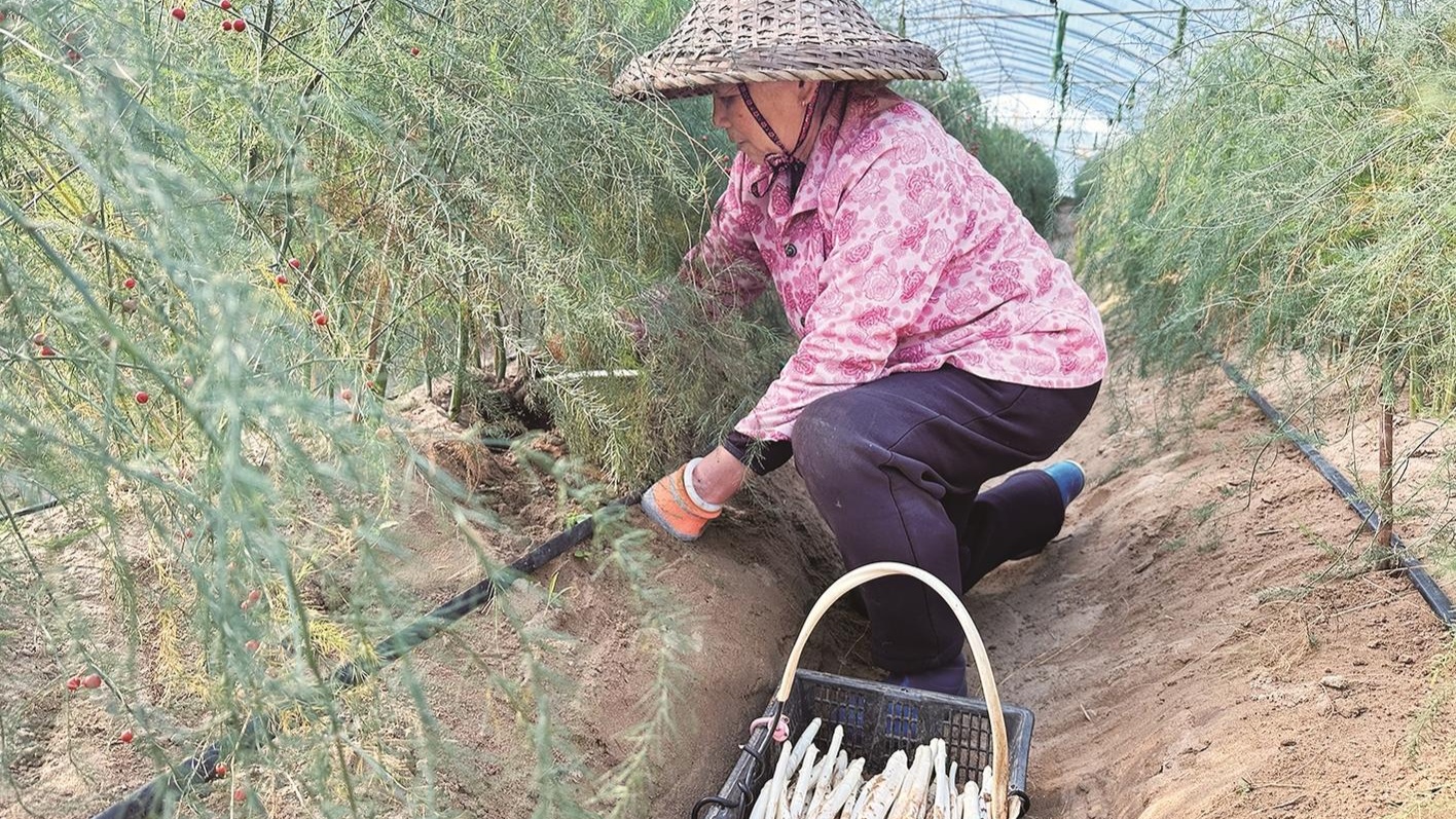 大棚内绿意盎然,嫩白的芦笋冲破沙地;工人们俯身垄间,顺着笋尖“一刨一掘一折”,“咔嚓”脆响里,整根白芦笋脱沙而出。