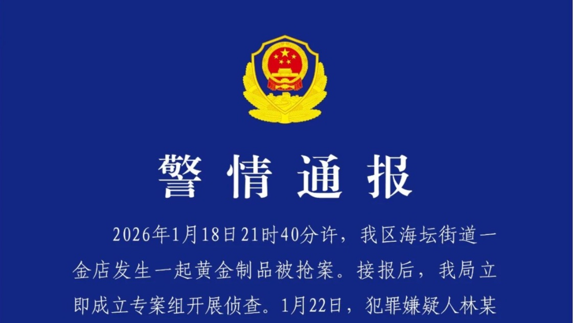 1月18日21时40分许,福建省平潭综合实验区海坛街道一金店发生一起黄金制品被抢案。1月23日上午,平潭综合实验区公安局发布警情通报。