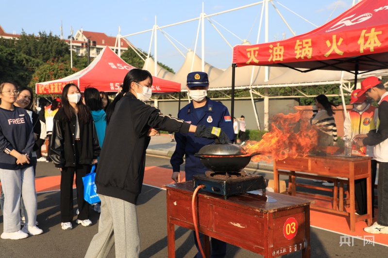 漳州卫生职业学院师生师生体验油锅起火灭火(央广网发 漳州消防供图)