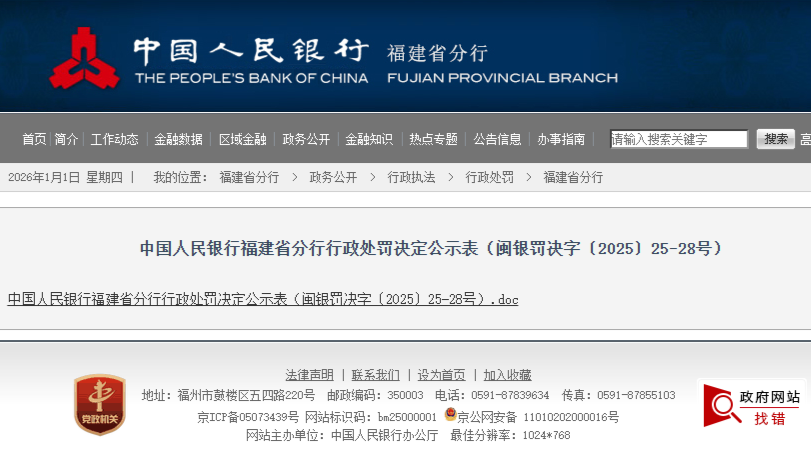 日前,中国人民银行福建省分行发布行政处罚决定公示表。