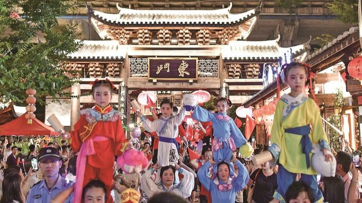 10月1日傍晚,沙县东门古街举办“肩上好戏游东门 锦绣虬城贺华诞”非遗展演踩街活动。