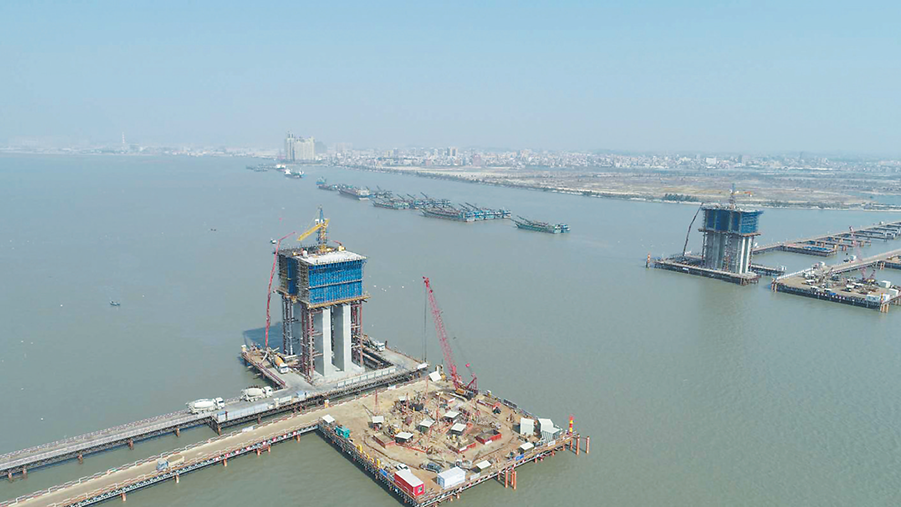 今年春节假期一结束,泉厦漳城市联盟路泉州段飞越安海湾的跨海大桥主桥工地,就已是一派热火朝天的施工场景。连日来,施工人员正在距海平面约40米高的墩柱上方进行挂篮拼装等工程作业。