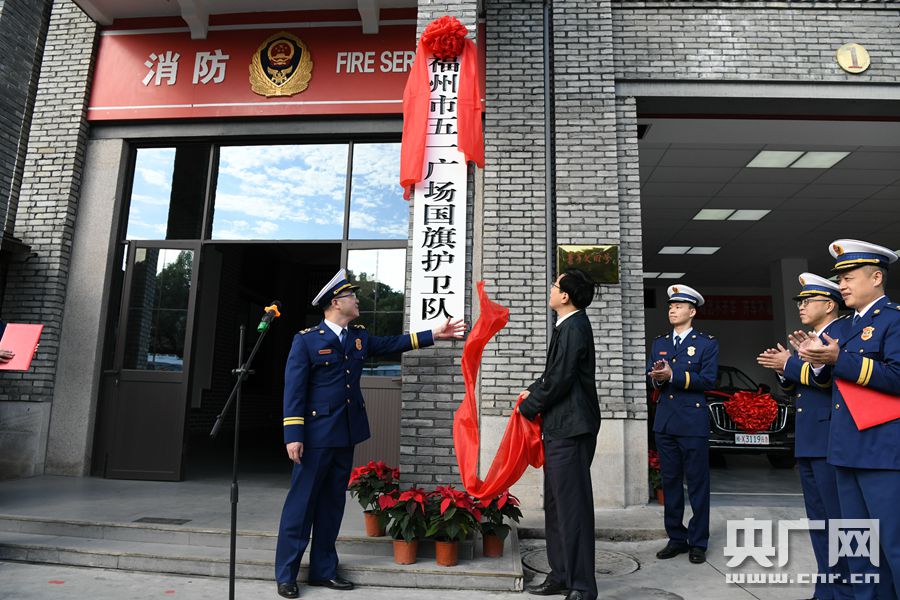 央广网11月7日消息(记者张子亚)今天上午,福州市消防救援支队举行国旗护卫队授牌仪式,福建省消防救援总队政委赖世雄和福州市委常委、常务副市长林飞为福州市五一广场国旗护卫队揭牌,这标志着五一广场国旗护卫队将以崭新的面貌呈现在市民面前。