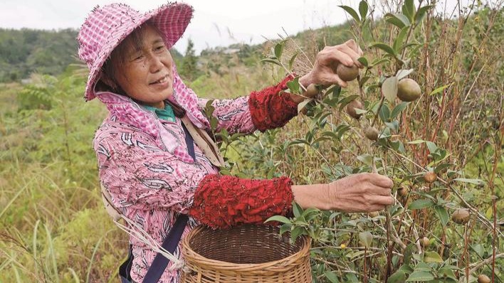 在宁化水保生态建设有限公司的油茶种植基地里,农户背着竹篓、手持工具,穿梭在茶树间,熟练地采摘着油茶果。