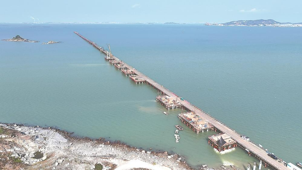 福建省最长的煤码头钢栈桥(约2.5公里)如钢铁巨龙般横亘于碧波——煤码头钢栈桥实现全线贯通。
