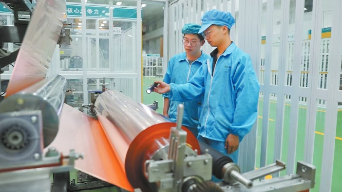 11月10日,在位于上杭工业园区南岗金铜产业园的福建紫金铜箔科技有限公司的无尘车间内,技术员正在查看铜箔产品的生产情况。