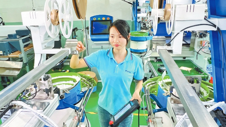 连日来,龙岩市富鑫达电子制造有限公司生产车间内,工人正在自动化生产线上检测产品。
