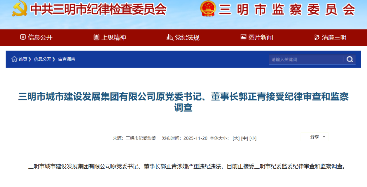 三明市城市建设发展集团有限公司原党委书记、董事长郭正青涉嫌严重违纪违法,目前正接受三明市纪委监委纪律审查和监察调查。
