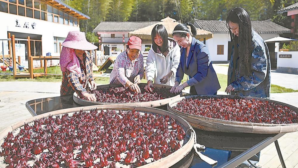 10月29日,在宁化县湖村镇蛟湖文旅小镇民宿前,村民在晾晒刚收的洛神花。