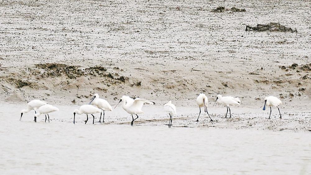 近日,在泉州市泉港区山腰盐场及周边的湿地滩涂上,摄影爱好者拍摄到国家一级保护野生动物黑脸琵鹭。
