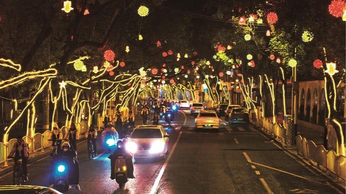 华灯初上,璀璨灯光点亮城市夜空,让路人倍感温馨,浓浓新春氛围扑面而来。
