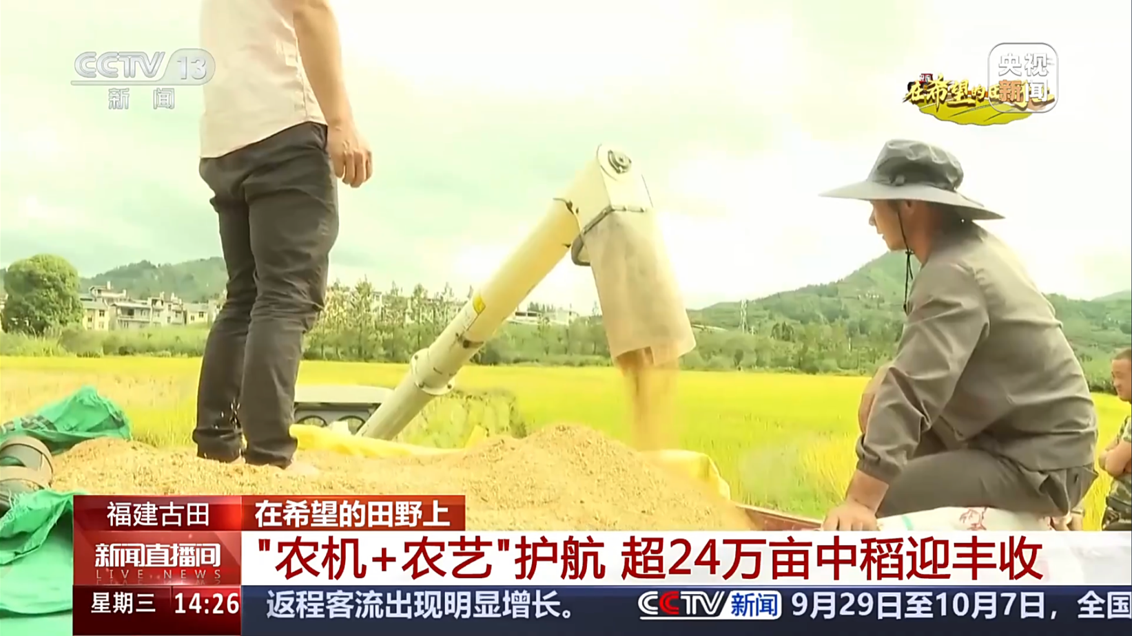 连日来,福建古田“农机+农艺”护航,超24万亩中稻迎丰收。