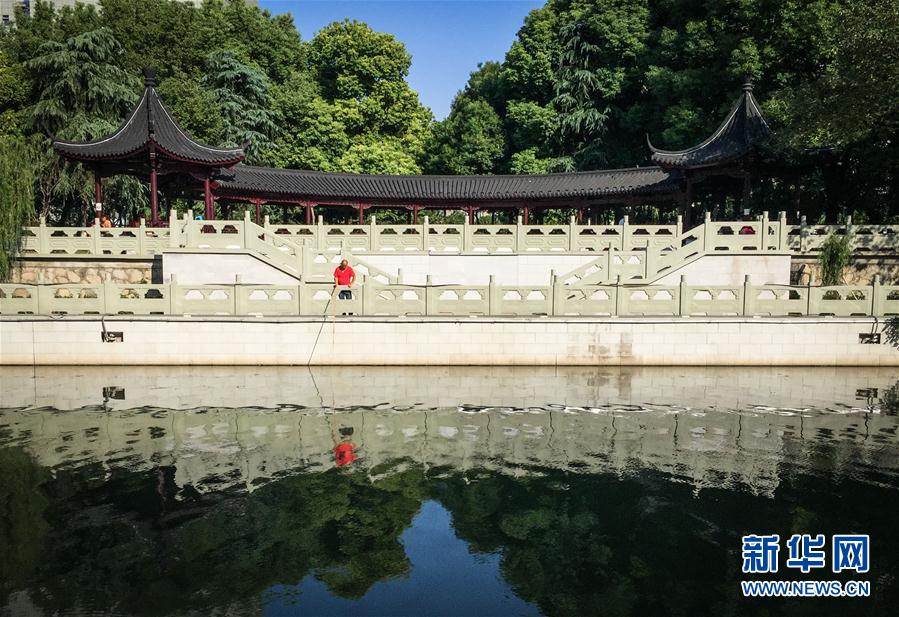 一名市民在整治一新的秦淮内河东段大中桥的河道边垂钓(10月9日摄)。 2017年起,江苏省南京市通过增加绿道透水面积、增设调蓄池等措施,加大黑臭河道整治力度,计划全年重点整治黑臭河道109条。目前,一批经过整治的内河河道已经展露新姿,城市环境大为改观。新华社记者 杨磊 摄 -