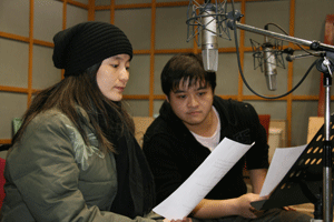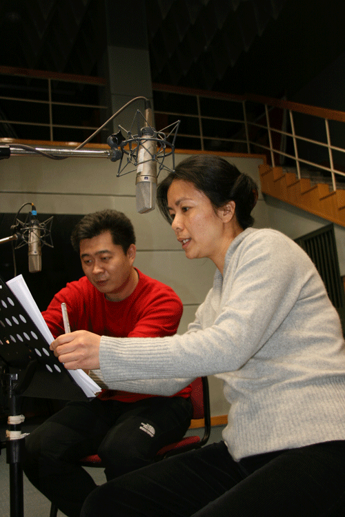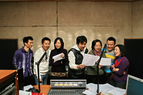 为中国之声在广播剧录音棚内录制节目。