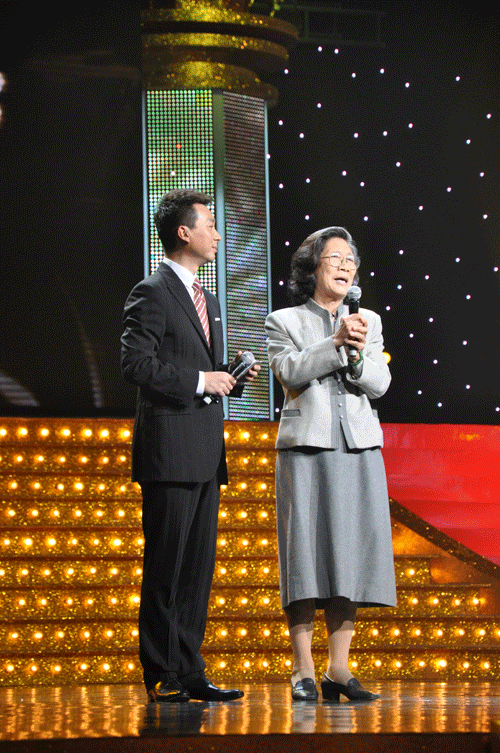 中央电台《深山信使》导演蔡淑文(右)在“辉煌60年”晚会发表感言。