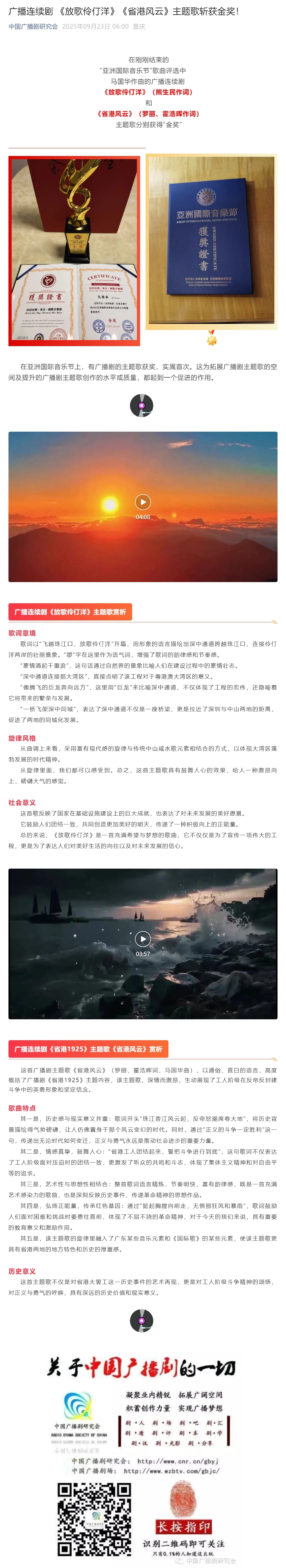 广播连续剧 《放歌伶仃洋》《省港风云》主题歌斩获金奖!