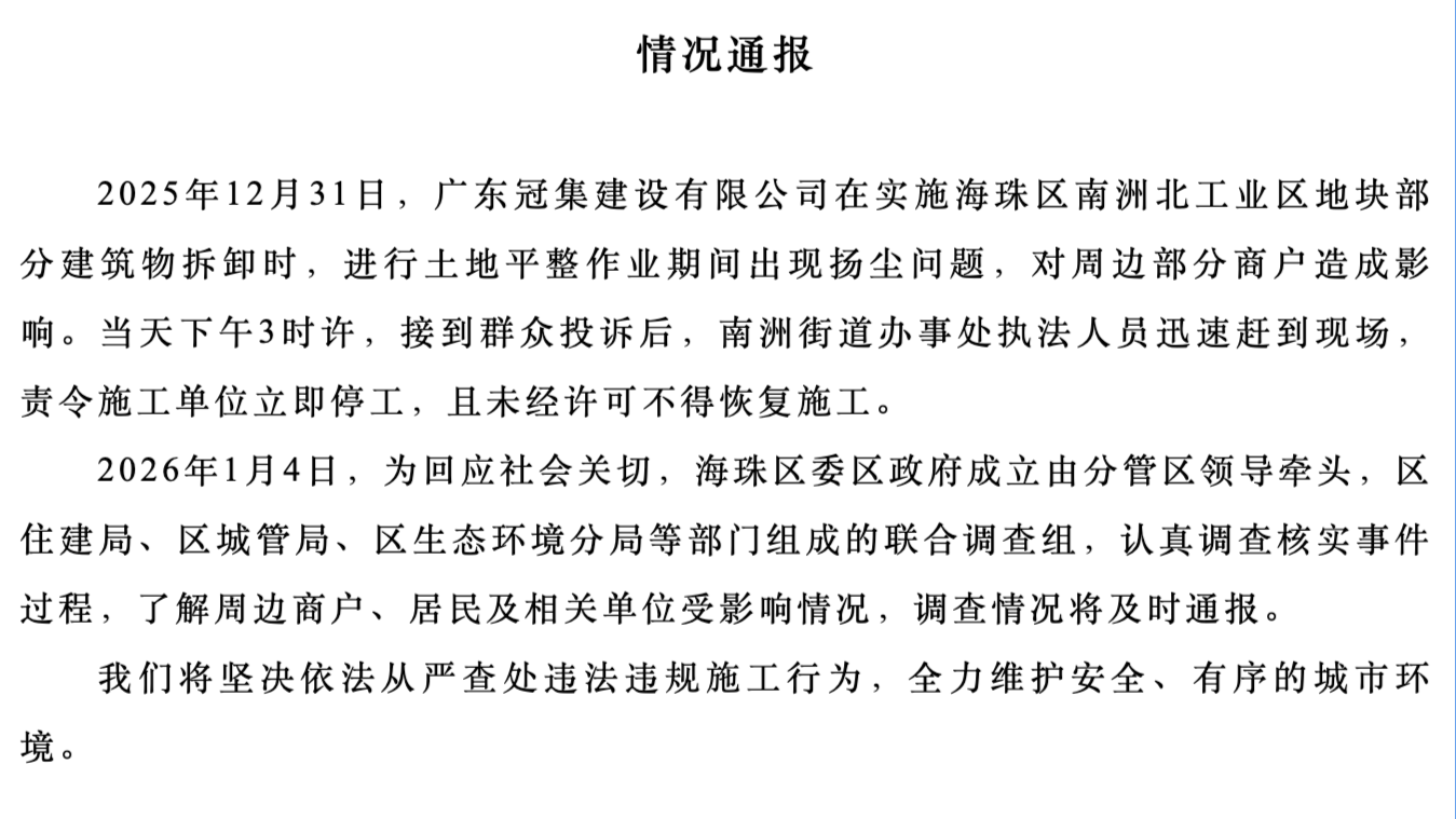 广州海珠回应扬尘投诉:施工单位被责令立即停工,联合调查组已成立