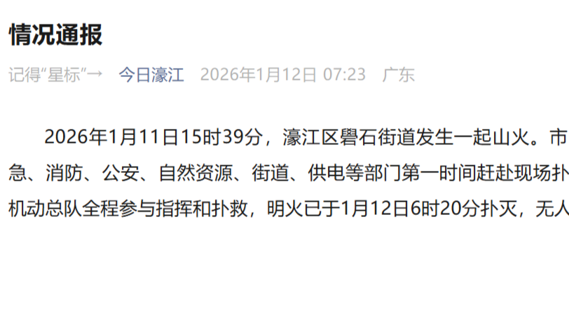 明火已于1月12日6时20分扑灭,无人员伤亡。