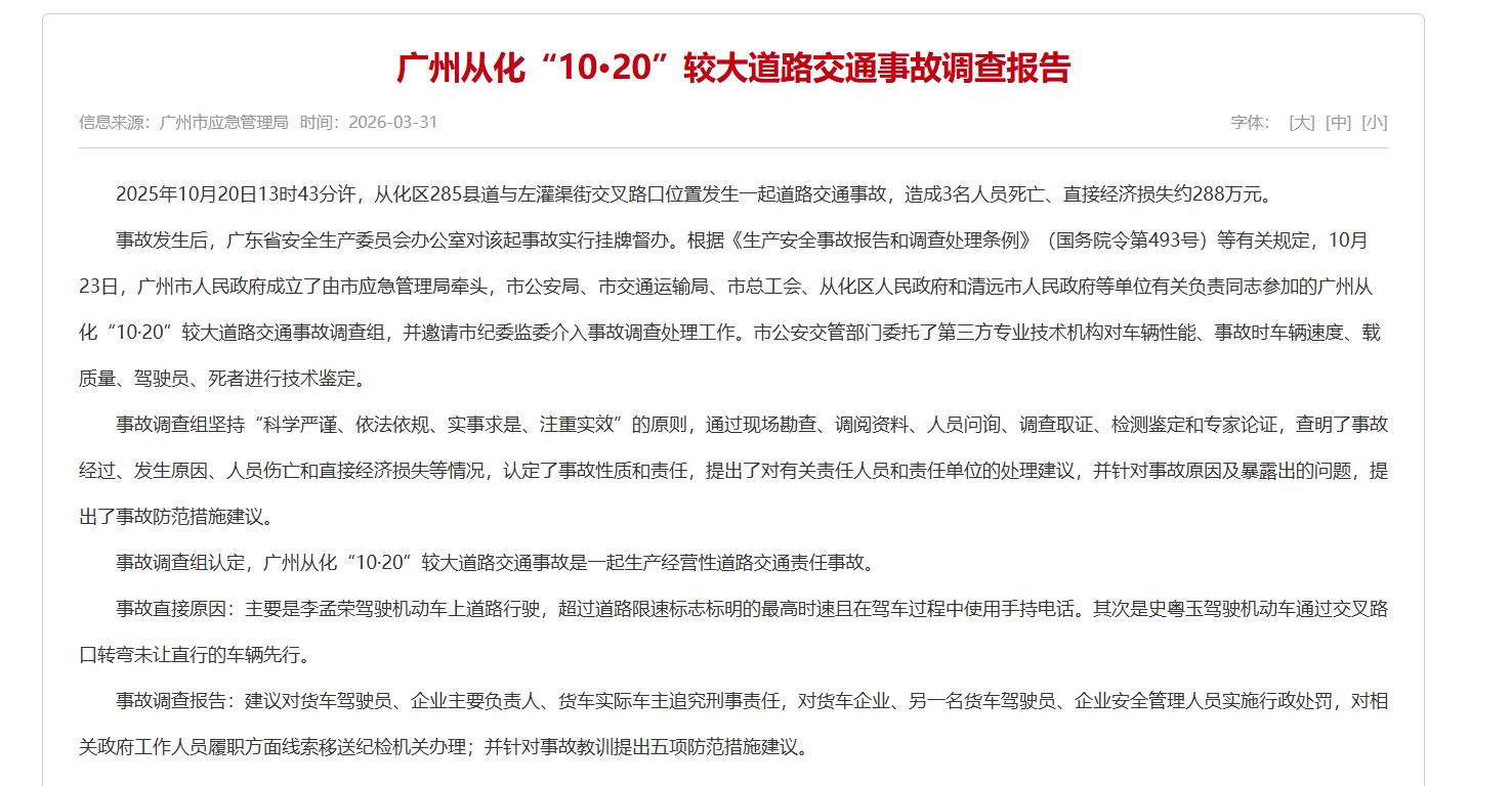 事故调查组认定,广州从化“10·20”较大道路交通事故是一起生产经营性道路交通责任事故。